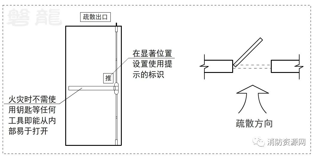 如图所示,多级嵌套的房间增设疏散门,疏散门采用火灾时能从内部易于打开的推杆式防火门(不需使用钥匙),开启方式包括火灾报警(手动报警)联动开启、失电自动开启、手动紧急开启等。(图示2)