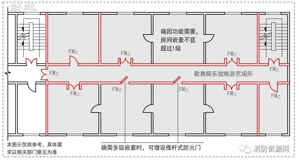 密室逃脱类场所,难免出现房间嵌套的布局方案,为满足安全疏散要求,嵌套宜限1级,并确保开门方向有利疏散,确需多级嵌套时,可增设推杆式防火门(可常闭)。(图示1)